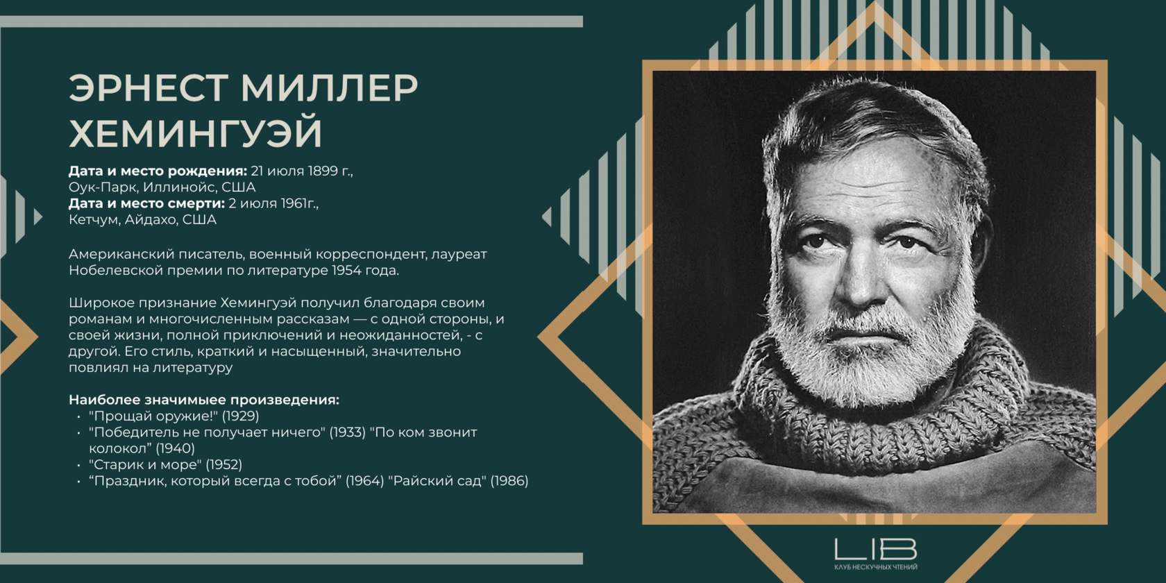 - Любил охотиться. Впечатления от длительного сафари в Восточной Африке легли в основу книги «Зеленые холмы Африки».