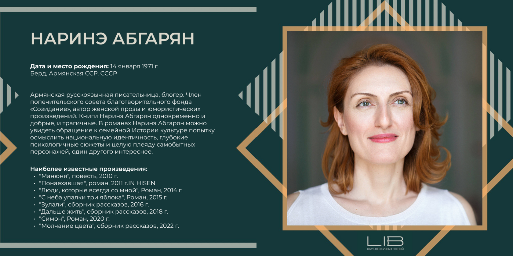 - Август 2015 года. Наринэ Абгарян названа одним из двух лауреатов Российской литературной премии имени Александра Грина - за выдающийся вклад в развитие отечественной литературы.