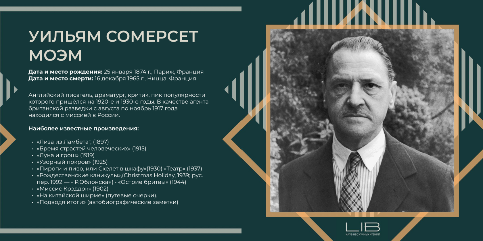 - Учредил премию Сомерсета Моэма, которая присуждается лучшим английским писателям в возрасте до тридцати пяти лет.