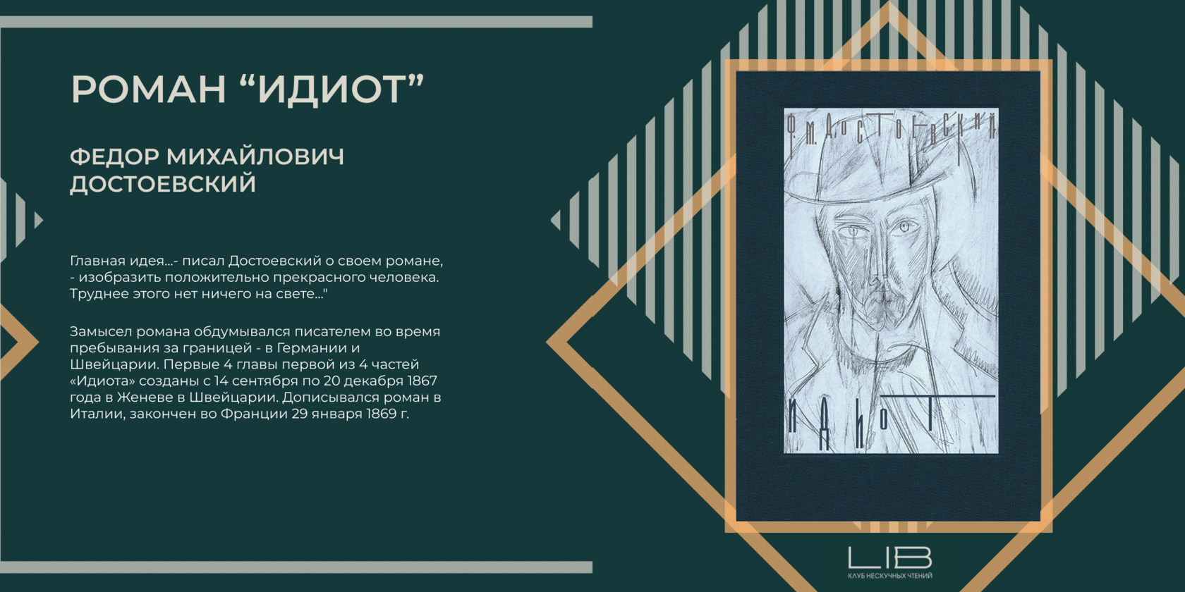 - Замысел романа обдумывался писателем во время пребывания за границей - в Германии и Швейцарии. Первые 4 главы первой из 4 частей «Идиота» созданы с 14 сентября по 20 декабря 1867 года в Женеве в Швейцарии. Дописывался роман в Италии, закончен во Франции 29 января 1869 г.