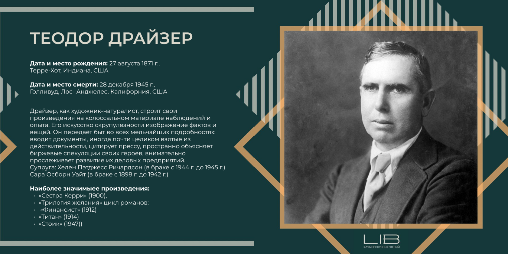 - Первой женой Теодора Драйзера была Саре Уайт - школьная учительница, но брак не оказался долговечным – пара разошлась через одиннадцать лет из-за увлечений Драйзера, но официально они так и не развелись.